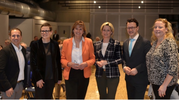 MIT Wirtschafts-Talk mit v.l.n.r. Dr. Thorsten Schwarz, Nicole LaCroix, Katrin Schütz, Ministerin Dr. Nicole Hoffmeister-Kraut, Robin Schuster und Inka Sarnow Gut gefüllte Europahalle: MIT Karlsruhe-Stadt und MIT Karlsruhe-Land laden zum wirtschaftspolitischen Jahresauftakt